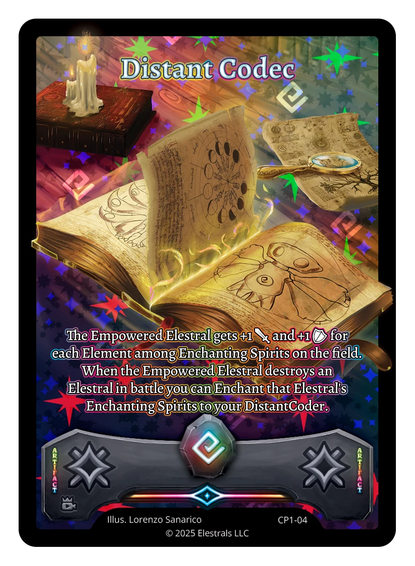Add the Distant Codec Creator Promo Card to your Elestals TCG collection. This exclusive promo card features unique artwork and is a standout addition for both competitive players and collectors.